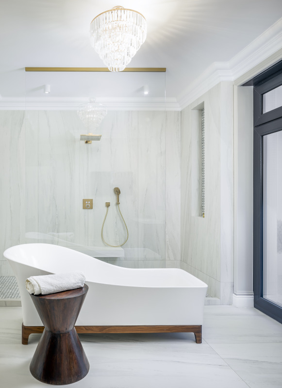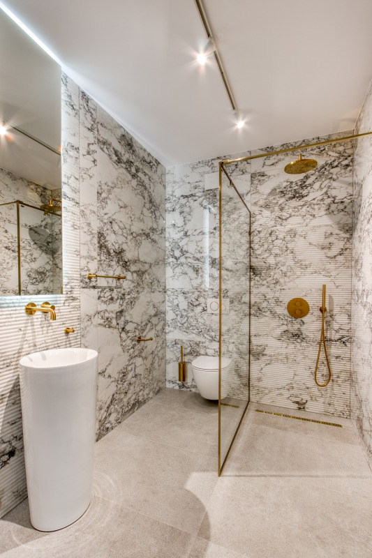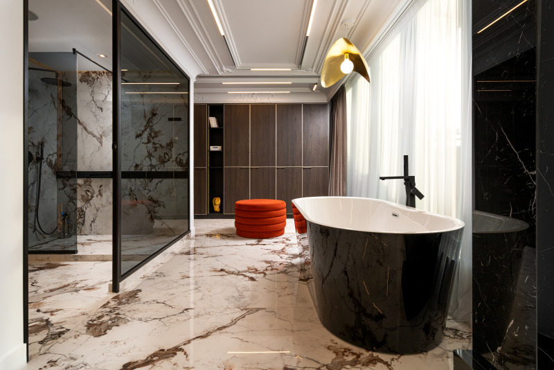Al doilea element este estetica. O baie reușită se integrează într-o poveste vizuală coerentă, ea nu este izolată de restul locuinței. Paletele cromatice preferate astăzi – nuanțe de alb, griuri sofisticate, bejuri calde sau verde salvie – creează o atmosferă calmă și atemporală. Materialele nobile, precum marmura, piatra naturală, lemnul sau sticla mată, dau sens și personalitate. Iluminatul stratificat, atent compus, adaugă dimensiunea emoțională, transformând un perete din piatră într-o scenă dramatică sau o cadă sculpturală într-un element central de spectacol. Într-o baie contemporană, estetica nu este doar despre frumusețe, ci despre atmosferă – despre felul în care spațiul te face să te simți.