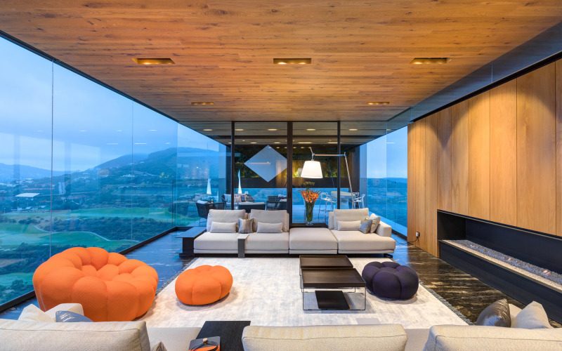 Arhitectii au decis sa puna in practica ideea de contrast intre exteriorul organic, opunandu-l unui interior caracterizat de liniile geometrice. In tot interiorul, regasim o serie de colectii Vondom. Este vorba despre Voxel, care poarta semnatura designerului Karim Rashid si care impodobeste zona de dining centrala, dar si terasa, cu a sa spectaculoasa priveliste panoramica. Sala de forta generoasa si alte patru camere sunt separate prin intermediul unui spatiu in care sunt amplasate o canapea, un fotoliu si o masuta din colectia Stones.
