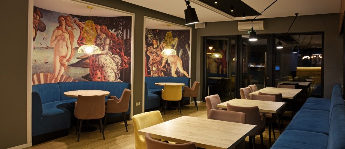 Interiorul capteaza imediat atentia gratie prezentei a doua fresce realizate din fototapet, una reprezentand nasterea zeitei Venus, cealalta intitulata Primavera, opere ale pictorului renascentist Sandro Boticelli. Aceasta alegere nu a fost intamplatoare, Boticelli fiind unul dintre cei mai pasionati cititori ai operelor lui Dante.