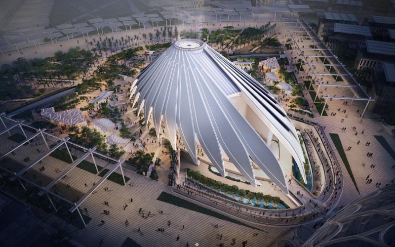 Unul dintre cele doua pavilioane proiectate de arhitectul spaniolo-elvetian – Calatrava a proiectat si pavilionul Qatarului – este, desigur, amplasat central si este inspirat din forma cortului beduinilor, fiind inconjurat de 28 de “aripi” mobile din fibra de carbon acoperite cu panouri fotovoltaice, care sugereaza un soim. Aspectul general al pavilionului situat in Al Wasl Plaza este inspirat din imaginea zeului soare Aton din mitologia egipteana.