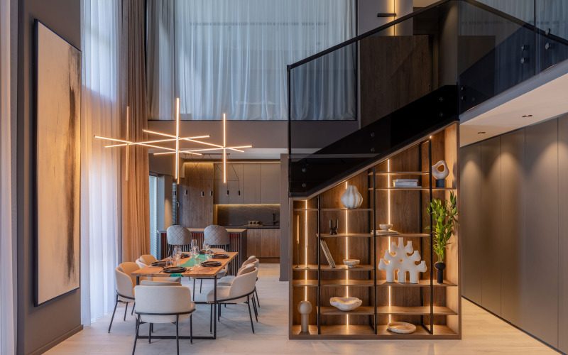 Propunerea de amenajare a fost una îndrăzneață, cu un design de accent, curajos. Griul antracit și negrul acoperă mare parte din pereți și mobilierul pe comandă. Scara spectaculoasă care devine centrul de atracție al casei, tabloul custom made de dimensiuni impresionante în zona de dining și luminile scenografice din întregul apartament conturează acest concept de amenajare.