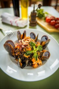Spaghetti nero di sepia Ingrediente: midii, calamari, rosii cherry, usturoi, busuioc, sos de rosii facut in casa, creveti, unt, ulei de masline.Pastele sunt facute din faina de grau fin si cerneala de sepie amestecata cu ou. Preparatul poarta semnatura Chef Patrizia Paglieri.