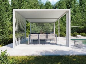 PERGOLA CU 2 MODULE CU PLAFON DIN PANZA SI LATERALE DIN LAMELE FIXE SI DRAPERII PERGOLA CU 2 MODULE CU PLAFON DIN PANZA SI LATERALE DIN LAMELE FIXE SI DRAPERII