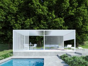 PERGOLA CU 2 MODULE CU PLAFON, PERETI LATERALI SI PARDOSEALA DIN LAMELE FIXE PERGOLA CU 2 MODULE CU PLAFON, PERETI LATERALI SI PARDOSEALA DIN LAMELE FIXE