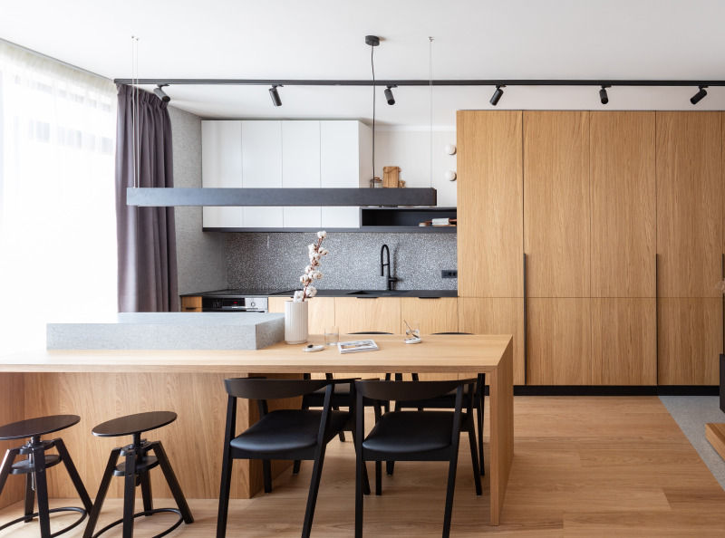 Totul este gândit în jurul ideii de eficiență și calm vizual. Mobilierul integrat, electrocasnicele ascunse și iluminarea subtilă creează un spațiu unde totul are un loc precis, iar estetica se contopește natural cu funcționalitatea.